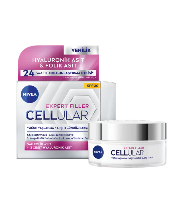 کرم سفت کننده پوست و ضد پیری نیوآ مدل NIVEA CELLULAR EXPERT FILLER. حاوی هیالورون خالص و کلاژن پوست صورت را سفت نموده و پر حجم نشان می دهد. با علایم ظاهری پیری پوست از قبیل افتادگی و چین و چروک ها مبارزه می کند و به روند احیاء و نوسازی پوست کمک می نماید. با فرمول حاوی ضدآفتاب SPF 30 از پوست شما در برابر اشعه های مضر و تابش نور خورشید محافظت می نماید.