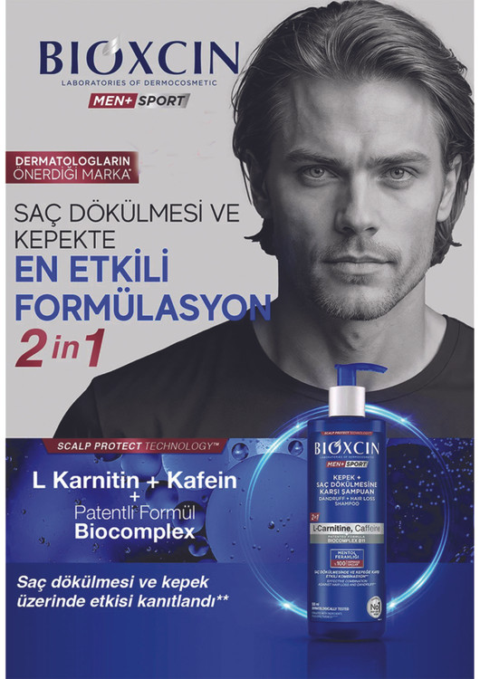 شامپو کافئین بیوکسین ضد شوره مردانه BIOXCIN مدل men + sport با عملکرد 2in1 و فرمول ویژه غنی شده با ال کارنیتین و کافئین، راه حلی موثر در برابر ریزش مو و شوره سر است
