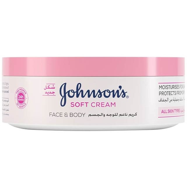 کرم مرطوب کننده صورت و بدن جانسون Johnsons Soft Cream مقابله کننده با سه علامت خشکی پوست شامل احساس کشیدگی، پوسته شدن و تیرگی می باشد. کرم مرطوب کننده جانسون حاوی عصاره شی باتر و گلیسیرین برای تغذیه و رطوبت رسانی پوست و عصاره کتان برای لطافت بخشی و احساس پوستی ابریشمی است. این کرم برای استفاده صورت و بدن مناسب است و فرمول غیر آلرژی زا دارد.